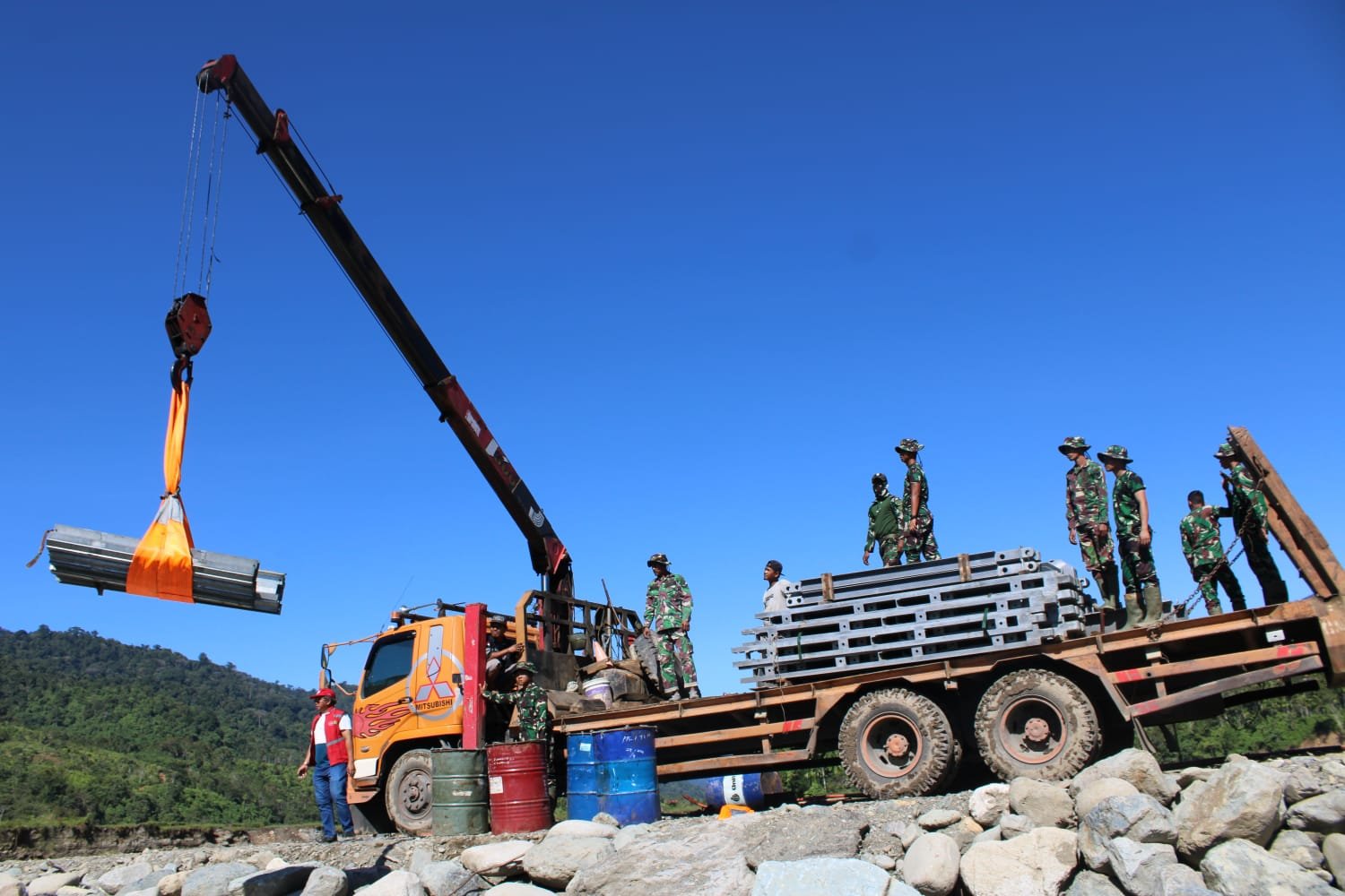 Para prajurit TNI yang tergabung bersama dinas terkait bahu-membahu menurunkan rangkaian komponen jembatan tersebut.