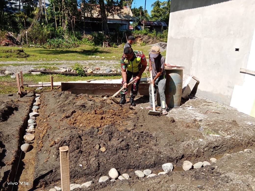 ACEH BARAT – Babinsa Koramil 01/Sungaimas Kodim 0105/Aceh Barat, Koptu Andri Suharsono, melaksanakan karya bakti membantu warga menimbun pondasi rumah milik warga binaan di Desa Tungkop, Kecamatan Sungaimas, Kabupaten Aceh Barat, Sabtu (27/09/2025).