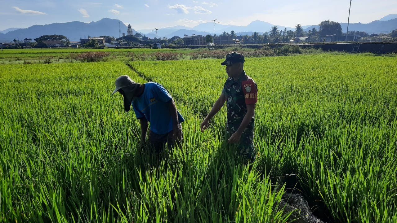 ACEH JAYA — Babinsa Koramil 01/Jaya Kodim 0114/Aceh Jaya, Serda Yunadi, bersama Abu Bakar selaku pemilik lahan, melaksanakan pemantauan pertumbuhan tanaman padi di Desa Lambaroh, Kecamatan Jaya, Minggu (15/02/2026).