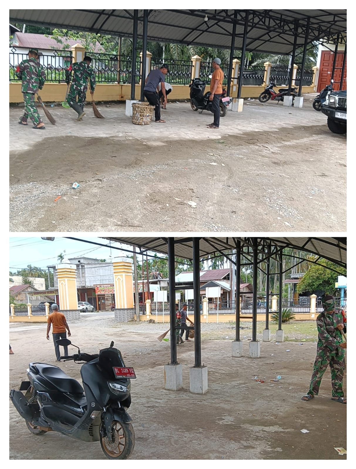 ACEH BARAT — Anggota Koramil 08/Arongan Lambalek Kodim 0105/Abar bersama masyarakat Desa Drien Rampak melaksanakan kegiatan gotong royong membersihkan pekarangan masjid setempat di Desa Drien Rampak, Kecamatan Arongan Lambalek, Kabupaten Aceh Barat, Kamis (11/12/2025).