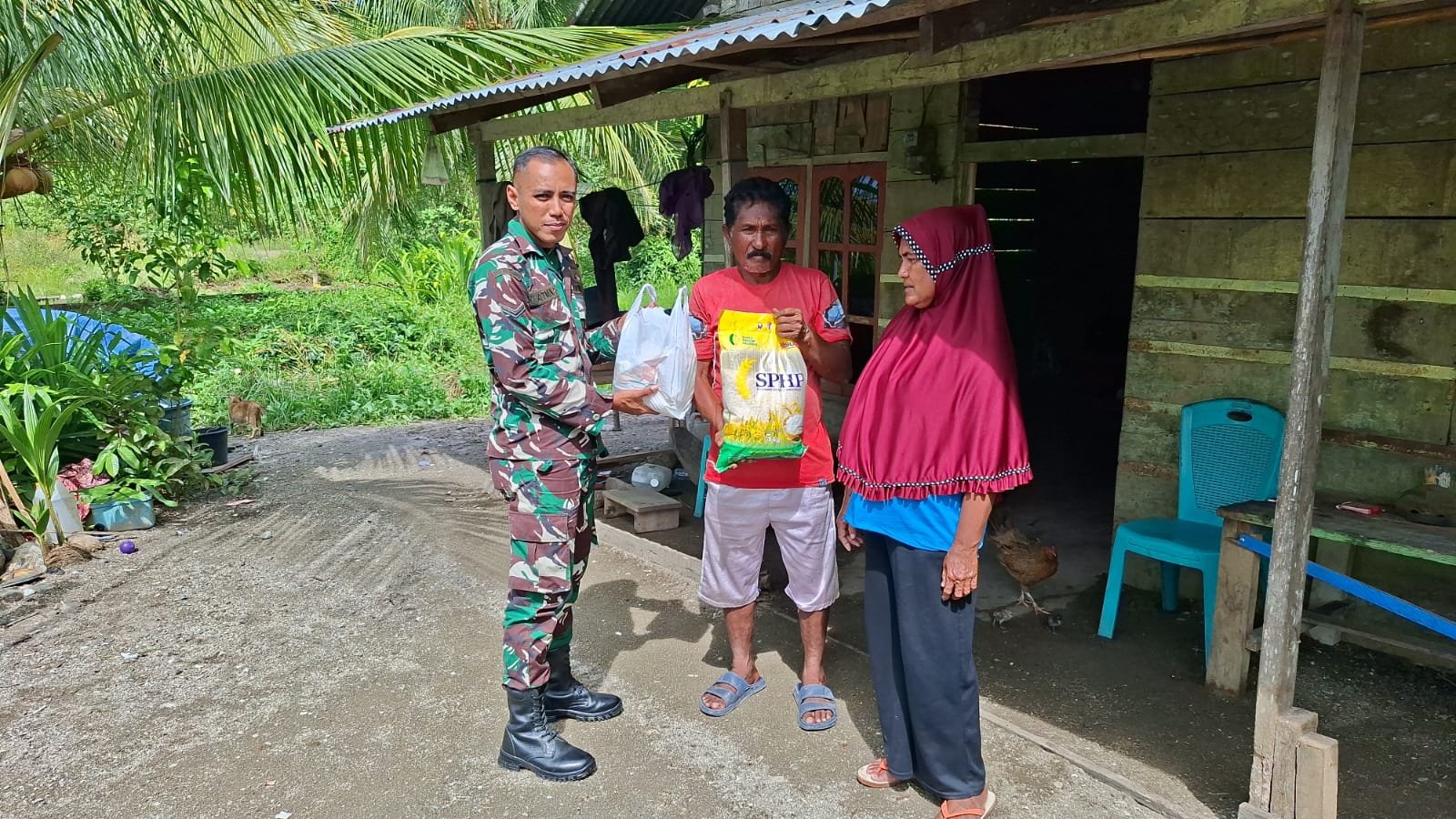 Salah satu warga yang menerima bantuan adalah Pak Ansar, Dalam kesempatan itu, Babinsa menyerahkan paket sembako berisi beras 5 kilogram, telur 1 papan, minyak goreng 1 liter, gula 1 kilogram, dan teh kotak.