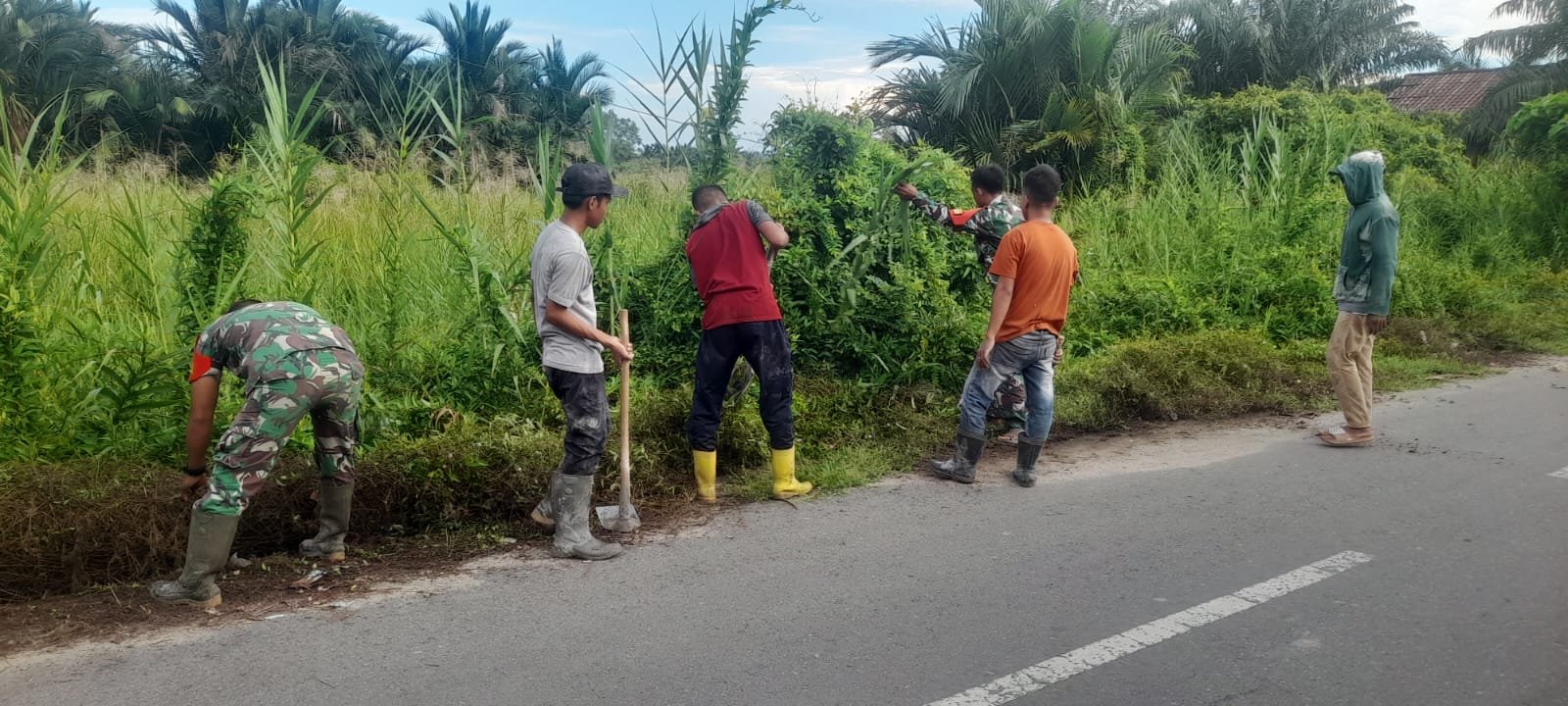 Sejak pagi hari, anggota TNI dan masyarakat terlihat bekerja bersama membersihkan rumput liar yang tumbuh di sepanjang jalan desa. Selain itu, mereka juga mengangkat sampah dan material yang dapat mengganggu akses jalan.