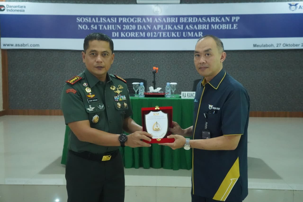 Meulaboh – Korem 012/TU menggelar kegiatan Sosialisasi Program ASABRI berdasarkan Peraturan Pemerintah (PP) Nomor 54 Tahun 2020 serta penggunaan aplikasi ASABRI Mobile, bertempat di Aula Makorem 012/TU, Kabupaten Aceh Barat, Senin (27/10/2025).