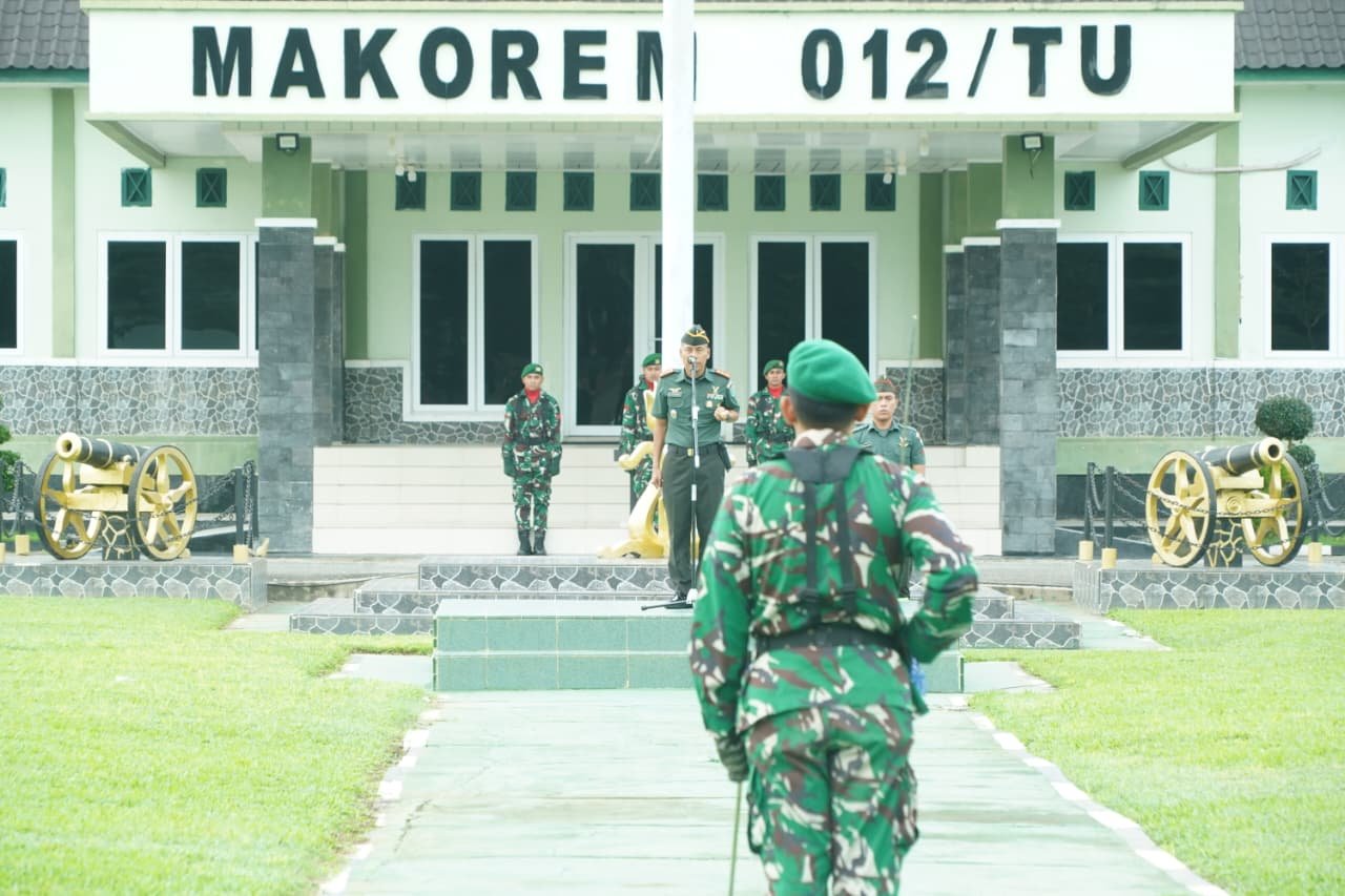 Meulaboh – Korem 012/Teuku Umar menggelar Upacara Bendera Mingguan sebagai bentuk penghormatan terhadap Sang Merah Putih serta untuk memperkuat semangat nasionalisme dan disiplin prajurit. Kegiatan ini berlangsung pada Senin pagi (24/11/2025) di lapangan upacara Makorem, Desa Ujong Tanoh Darat, Kecamatan Meureubo, Kabupaten Aceh Barat.