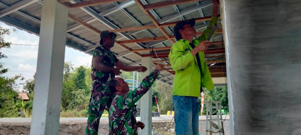 Terlihat para anggota Satgas TMMD bersama warga bahu-membahu melakukan pemasangan kerangka plafon di bagian teras mushola. Semangat gotong royong pun tampak jelas dalam setiap tahapan pekerjaan, mencerminkan kemanunggalan TNI dengan rakyat.