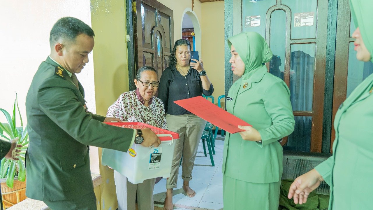 FAKFAK – Ny. Irwan Budiana, Ketua Persit KCK Koorcabrem 182 PD XVIII/Kasuari mengunjungi dan menyerahkan tali asih kepada para Warakawuri di Kabupaten Fakfak, Papua Barat, Jumat (3/10/2025).
