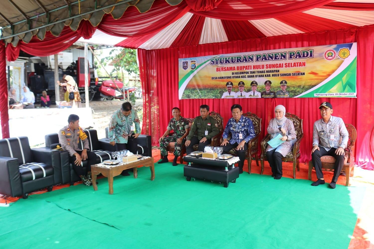 HULU SUNGAI SELATAN – Berlokasikan di area persawahan Kelompok Tani Tunas Harapan Desa Hamayung Utara Kecamatan Daha Utara Kabupaten Hulu Sungai Selatan (HSS) Kapten Inf Abdi Brawijaya Danramil 1003-08/Daha Utara bersama Unsur Pemerintah Daerah Wakil Bupati HSS, H. Suriani, S. Sos, M. AP. Berserta masyarakat dan petani melaksanakan syukuran panen padi seluas 8.086 hektar dan cabai merah sebanyak 55 ribu pohon. Kamis (9/19/25) sore waktu setempat
