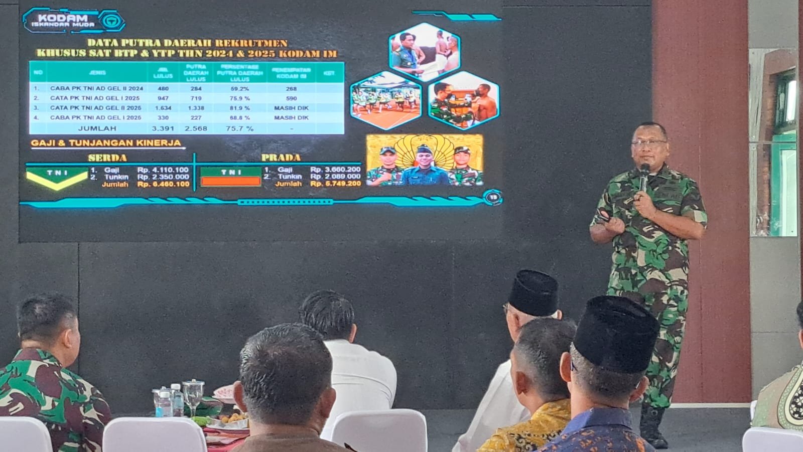 ACEH BARAT – Kapok Sahli Pangdam Iskandar Muda (IM) Brigjen TNI Dr. Bambang Sulistyo Hery, S.Sos., M.Han., memberikan sosialisasi terkait pembentukan Satuan baru Batalion Teritorial Pembangunan (Yon TP) di Makodim 0105/Aceh Barat, Jalan Imam Bonjol, Desa Drien Rampak, Kecamatan Johan Pahlawan, Jumat (17/10/2025).