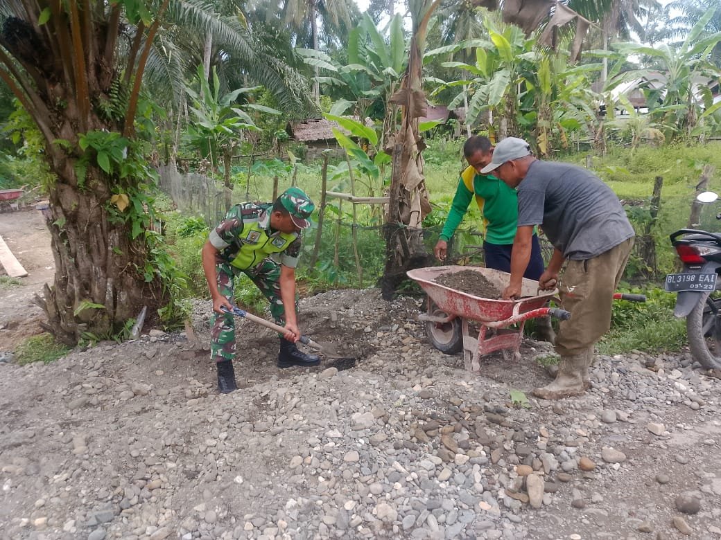 ACEH BARAT – Babinsa Koramil 02/Woyla, Kodim 0105/Aceh Barat, Sertu M. Dahlan membantu meringankan pekerjaan warga dengan mengangkat pasir untuk pembangunan rumah tempat tinggal salah seorang warga binaan di Desa Pasi Aceh, Kecamatan Woyla, Kabupaten Aceh Barat, Jumat (10/10/2025).