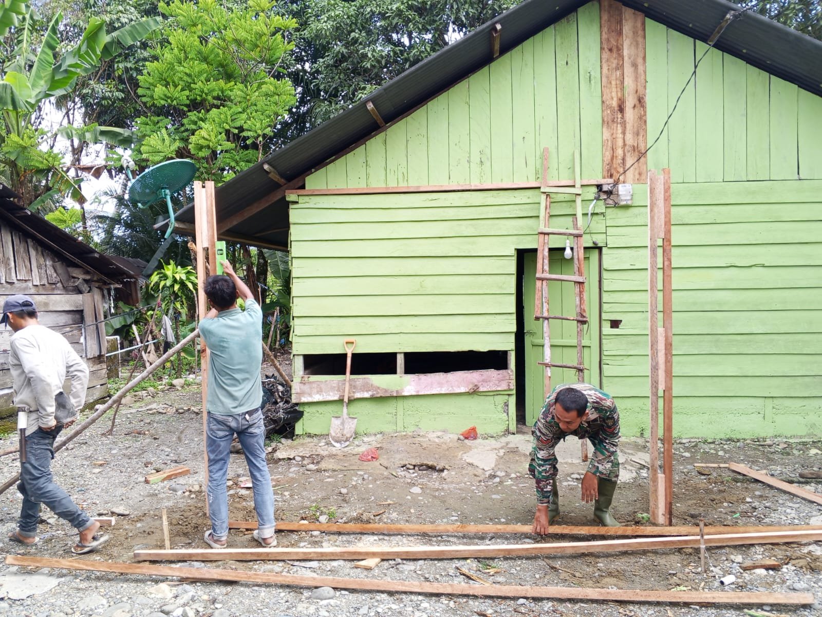 <p>Perehaban rumah kayu sederhana ini dikerjakan secara gotong royong. Denting palu dan gesekan gergaji berpadu seperti irama kerja yang menyatukan tekad. Satgas dan warga bahu-membahu memastikan setiap sambungan kokoh dan setiap sudut terpasang rapi.</p>