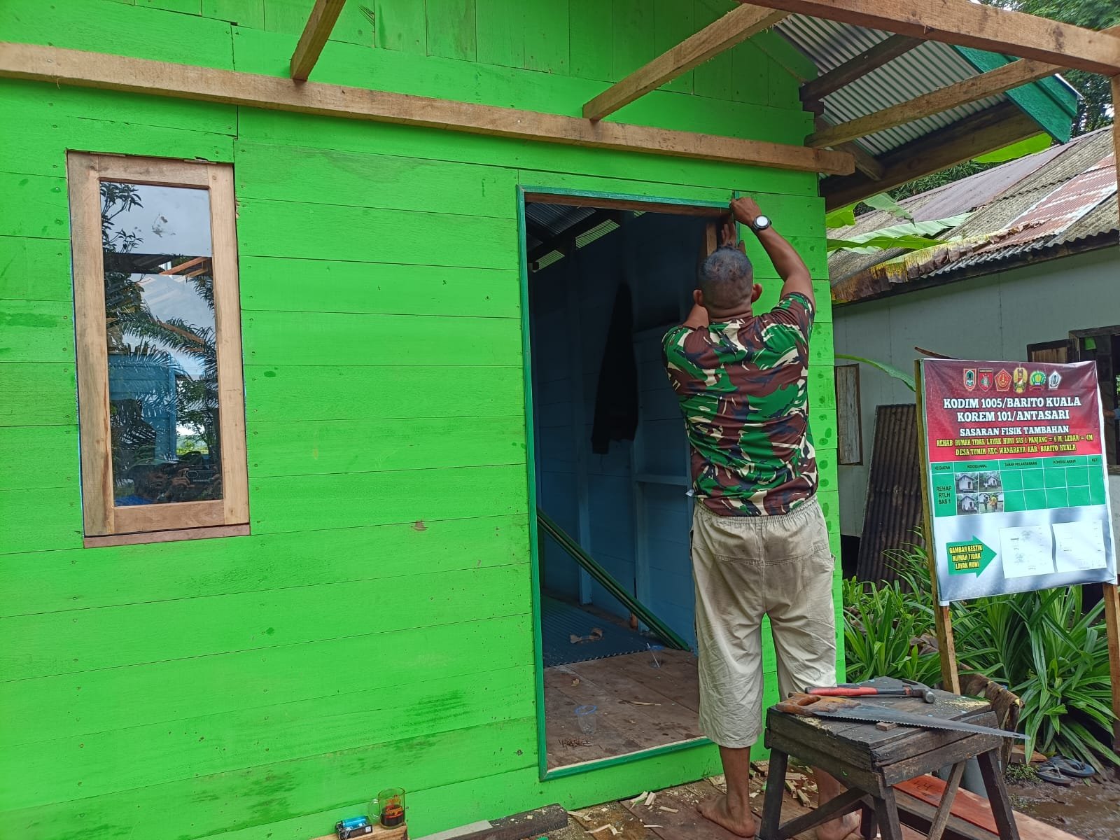 Meski cuaca sempat mendung, tak menyurutkan semangat anggota Satgas TMMD dalam menyelesaikan pekerjaan rehab rumah tidak layak huni (RTLH). Rumah ini merupakan salah satu dari dua unit sasaran utama di program TMMD Ke-126 Kodim 1005/Barito Kuala.