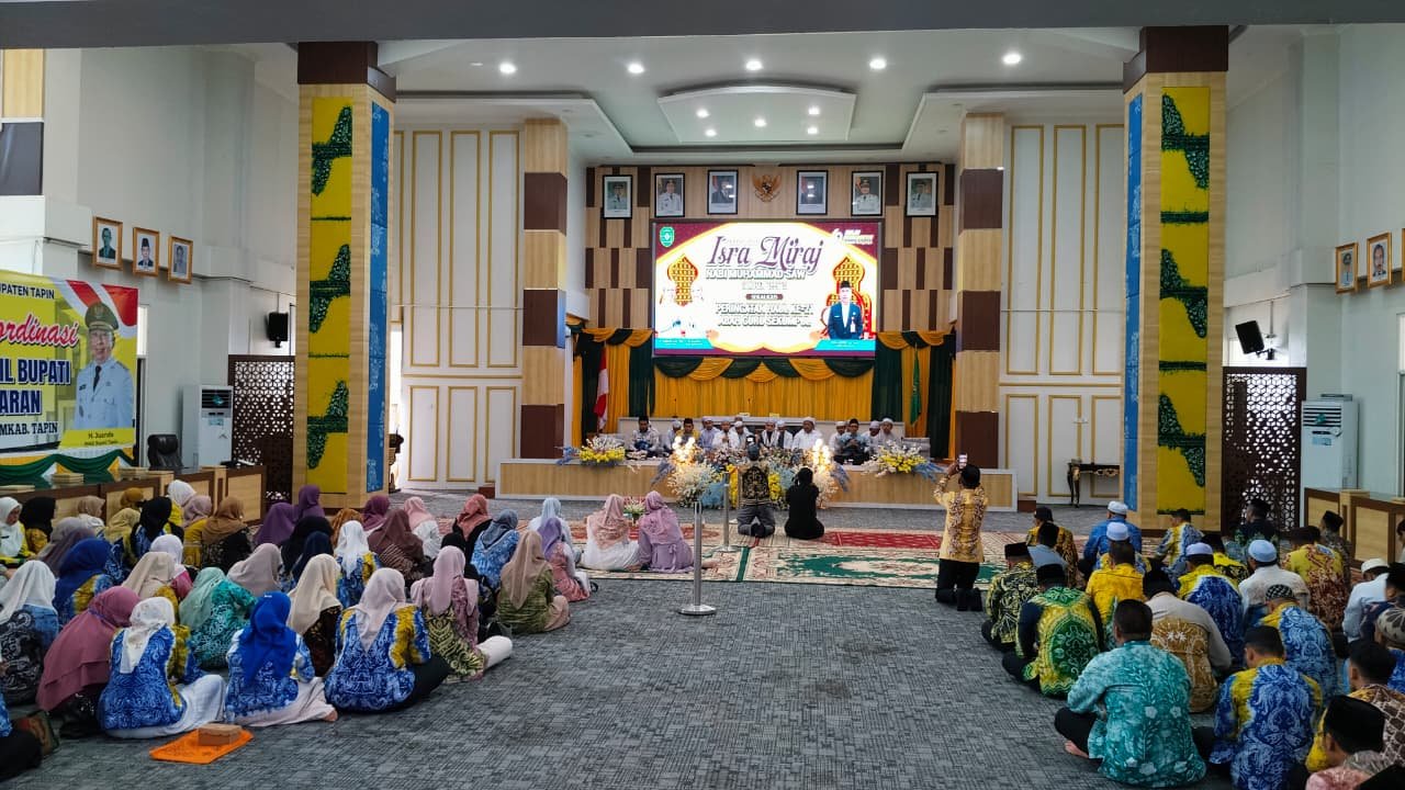 Bupati Tapin H. Yamani, S.AK., M.M menyampaikan rasa syukur ke hadirat Allah SWT karena atas rahmat dan karunia-Nya seluruh undangan dapat hadir dan berkumpul dalam suasana penuh kebersamaan pada peringatan Isra Mi’raj Nabi Muhammad SAW. Shalawat serta salam juga senantiasa dipanjatkan kepada Nabi Besar Muhammad SAW, beserta keluarga, sahabat, dan pengikutnya hingga akhir zaman.