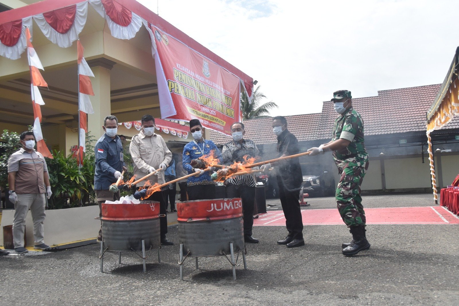HULU SUNGAI SELATAN – Komandan Kodim 1003/Hulu Sungai Selatan (HSS) Letkol Inf Putut Januarto, menghadiri dan mengikuti kegiatan pemusnahan barang bukti perkara yang telah berkekuatan hukum tetap di Kejaksaan Negeri (Kejari) Kabupaten HSS yang berlangsung di halaman Kantor Kajari Jl. Jnd Sudirman Kabupaten HSS. Kamis (27/11/25)