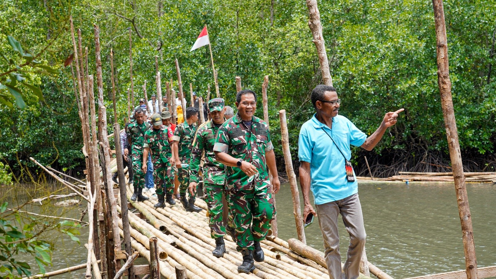 <p>Dalam kegiatan tersebut, Danrem bersama Dandim, prajurit, serta masyarakat setempat melaksanakan kerja bakti. Salah satu fokus peninjauan adalah kondisi akses penghubung berupa jembatan bambu yang menghubungkan Kampung Hambriankendik dengan Pulau Bonyom. Jembatan ini memiliki peran vital sebagai jalur mobilitas warga dan para peziarah yang akan menghadiri peringatan bersejarah tersebut.</p>