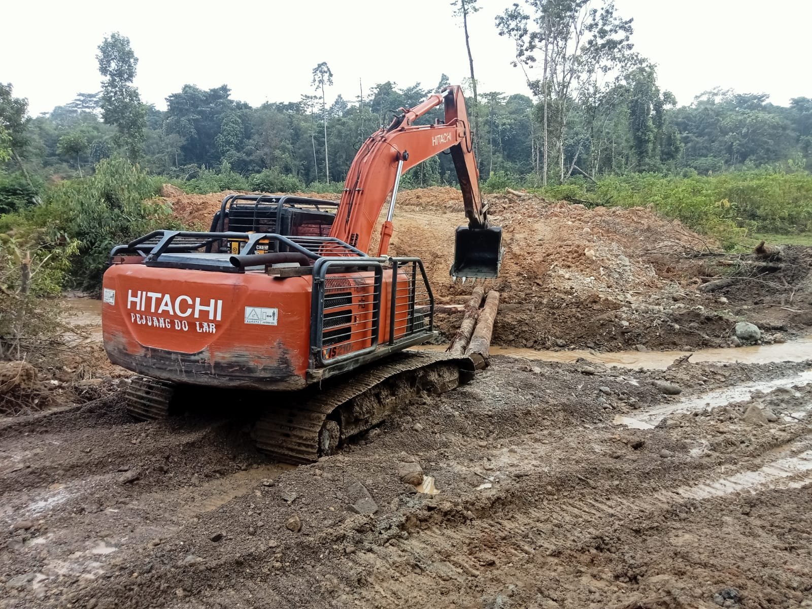 Excavator tampak bekerja perlahan mengeruk tanah, membentuk ruang yang nantinya akan dipasang gorong-gorong. Pekerjaan ini menjadi bagian penting dalam konstruksi jalan agar aliran air tetap terjaga.