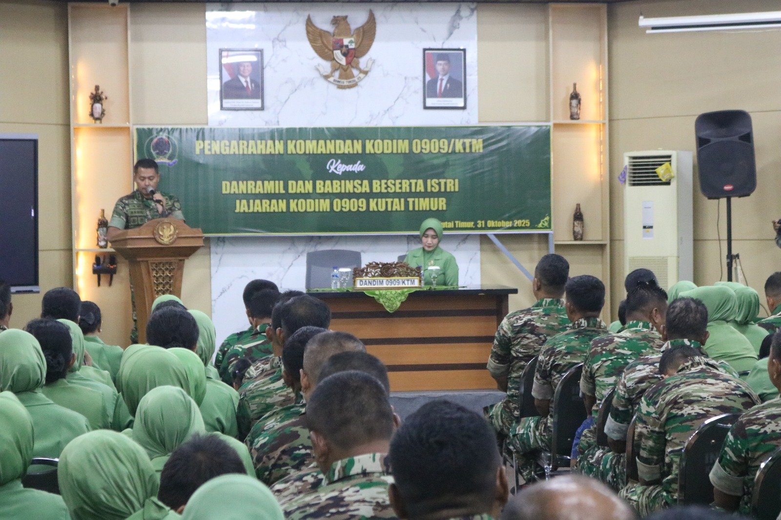 KUTAI TIMUR – Persit Kartika Chandra Kirana sebagai organisasi istri prajurit TNI Angkatan Darat memiliki peran dan tanggung jawab besar dalam mendukung tugas pengabdian suami kepada bangsa dan negara. Hal tersebut disampaikan Dandim 0909/Kutai Timur Letkol Arh Ragil Setyo Yulianto saat memberikan arahan dalam apel Danramil dan Babinsa jajaran Kodim 0909/Kutai Timur beserta istri, yang dilaksanakan di Aula Makodim 0909/Kutai Timur, Jalan Teritorial, Komplek Perkantoran Bukit Pelangi, Kelurahan Teluk Lingga, Kecamatan Sangatta Utara, pada Jumat (31/10/2025).