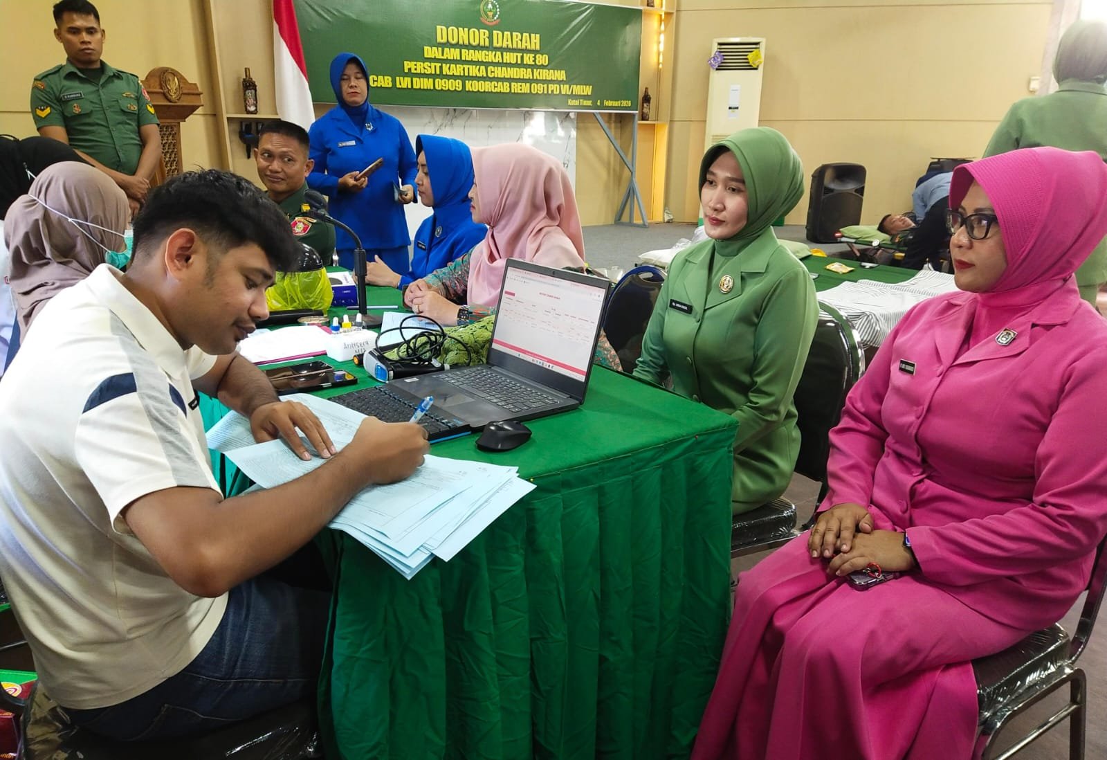 Ketua Persit Kartika Chandra Kirana Cabang LVI Kodim 0909/Kutai Timur, Ibu Aida Ragil Setyo Yulianto, menyampaikan bahwa kegiatan donor darah ini merupakan salah satu rangkaian peringatan HUT ke-80 Persit Kartika Chandra Kirana sekaligus bentuk kepedulian Persit terhadap sesama.