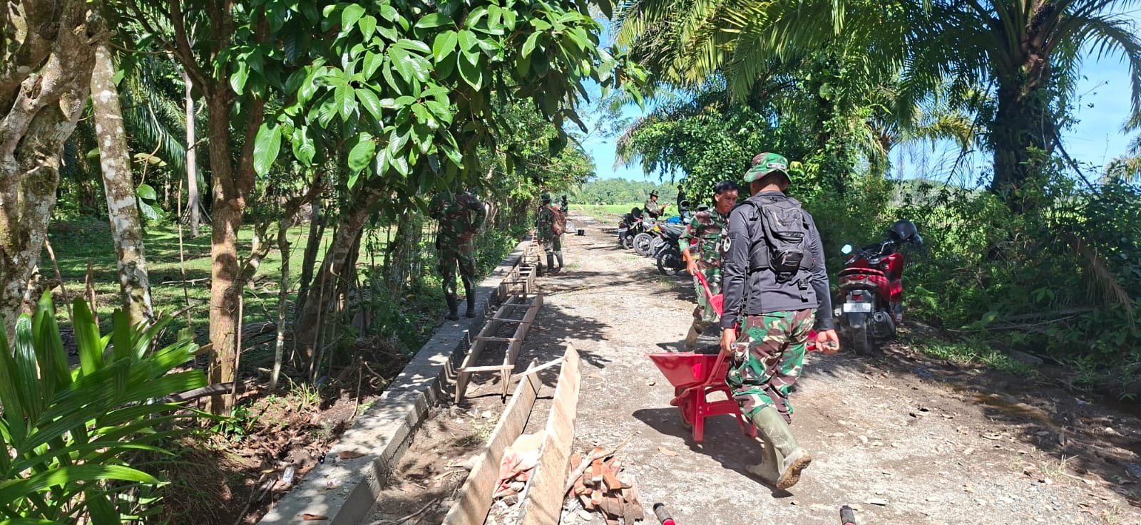 Campuran semen yang terus diaduk menggambarkan persatuan. Walau panas dan medan berat menghadang, pekerjaan tetap berjalan stabil.