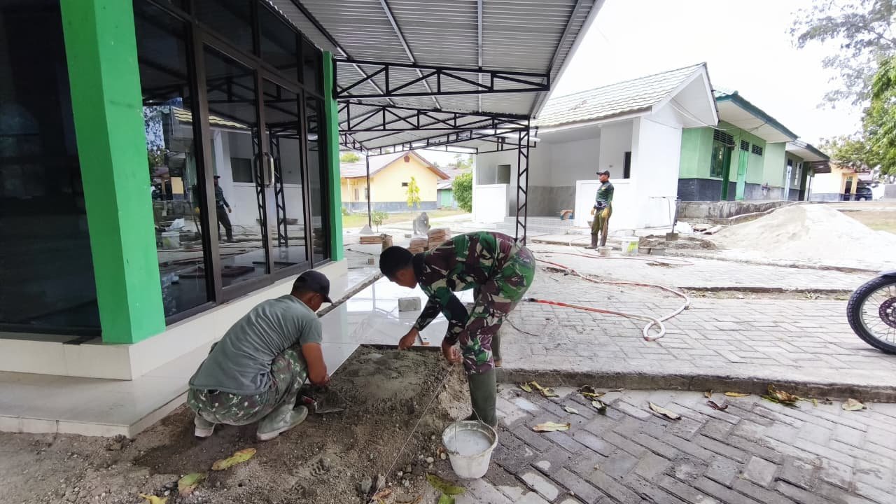 Pemasangan dilakukan secara gotong royong oleh para prajurit dengan penuh semangat dan rasa tanggung jawab. Mereka tampak kompak menata granit satu per satu, memastikan tiap keping terpasang kuat dan presisi. Meski di bawah terik matahari, semangat prajurit tidak surut demi menciptakan tempat ibadah yang layak dan representatif.