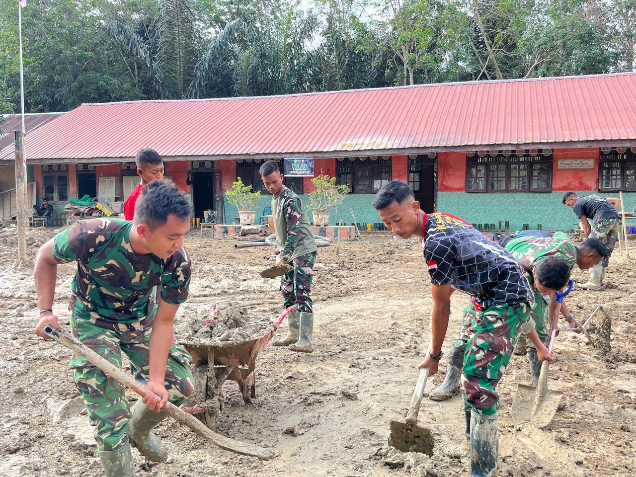 Prajurit Korem 012/TU Berpacu dengan Waktu Bersihkan SDN 2 Rantau Pauh
