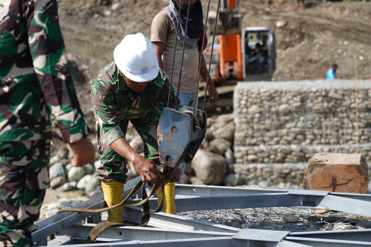 Meski di bawah terik panas matahari, proses perakitan jembatan tetap berjalan lancar. Kondisi tersebut tidak menyurutkan semangat para prajurit dan unsur terkait untuk segera mengembalikan akses vital bagi mobilitas masyarakat.