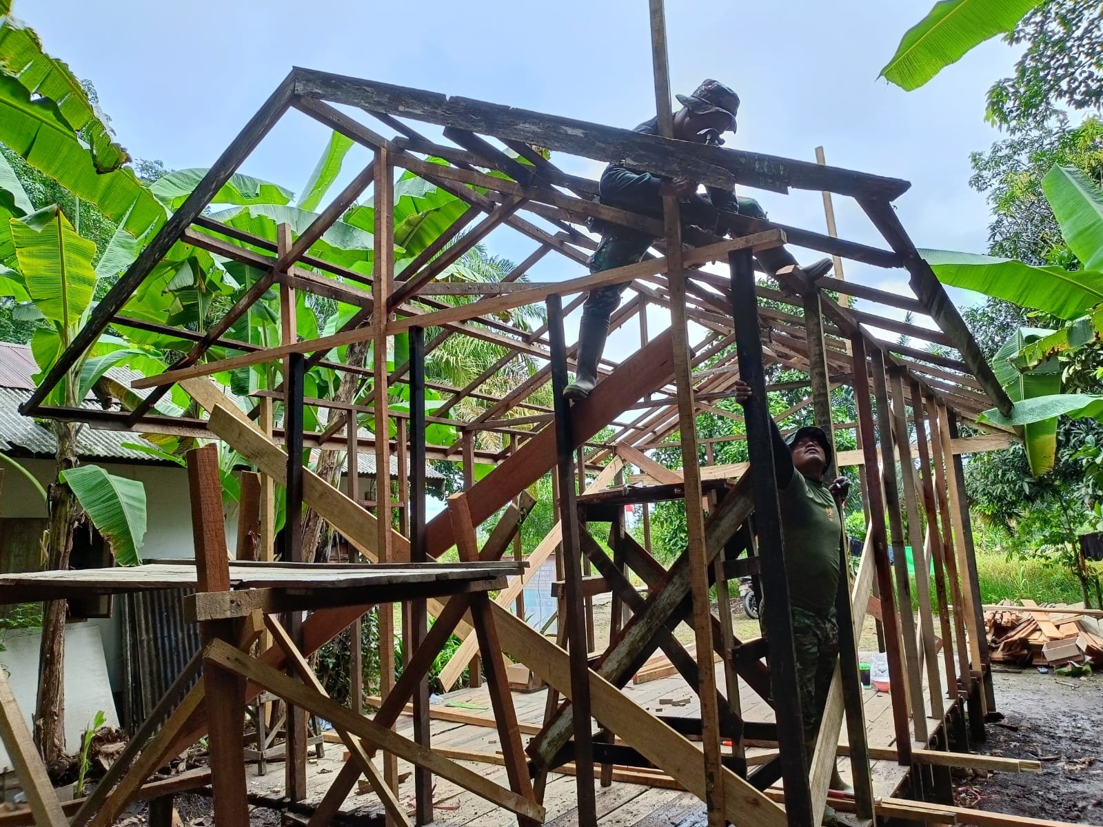 Setiap hari, suara palu dan gergaji terdengar dari lokasi pembangunan. Sejumlah prajurit TNI bahu membahu bersama warga memasang tongkat, glagar, dan tiang utama rumah. Meski panas terik, semangat gotong royong tidak pernah surut.