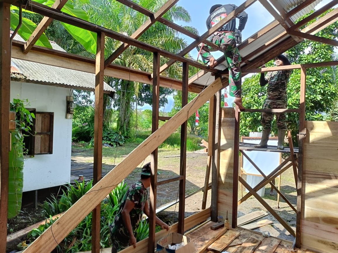 Rumah milik Kai Zaini, salah satu penerima manfaat RTLH, kini sudah mulai tampak bentuknya setelah Satgas TMMD fokus mengerjakan pemasangan atap dan dinding papan kayu.