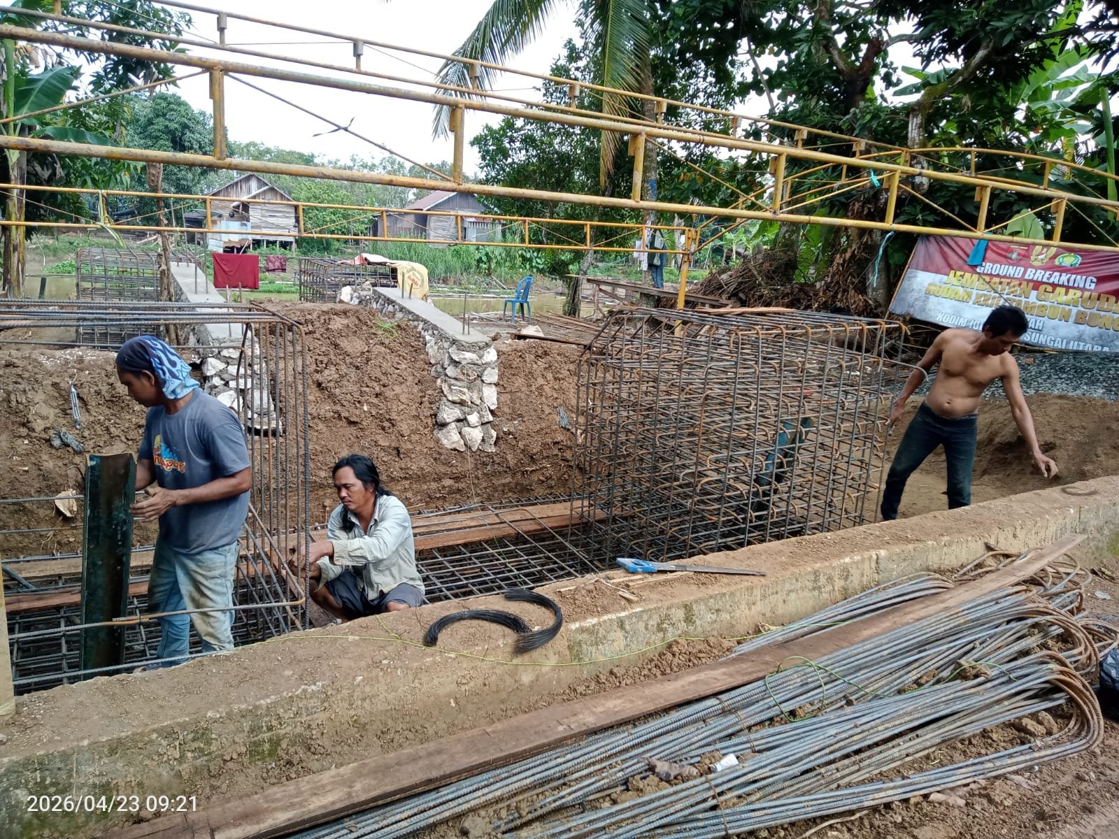 <p><strong>HULU SUNGAI UTARA &#8211; </strong>Pembangunan Jembatan Garuda yang menghubungkan Desa Tangkawang dan Desa Tuhuran terus menunjukkan kemajuan signifikan. Pada Kamis (23/04/2026), kegiatan di lapangan difokuskan pada tahapan penting, yakni perakitan komponen jangkar di dua titik strategis.</p>