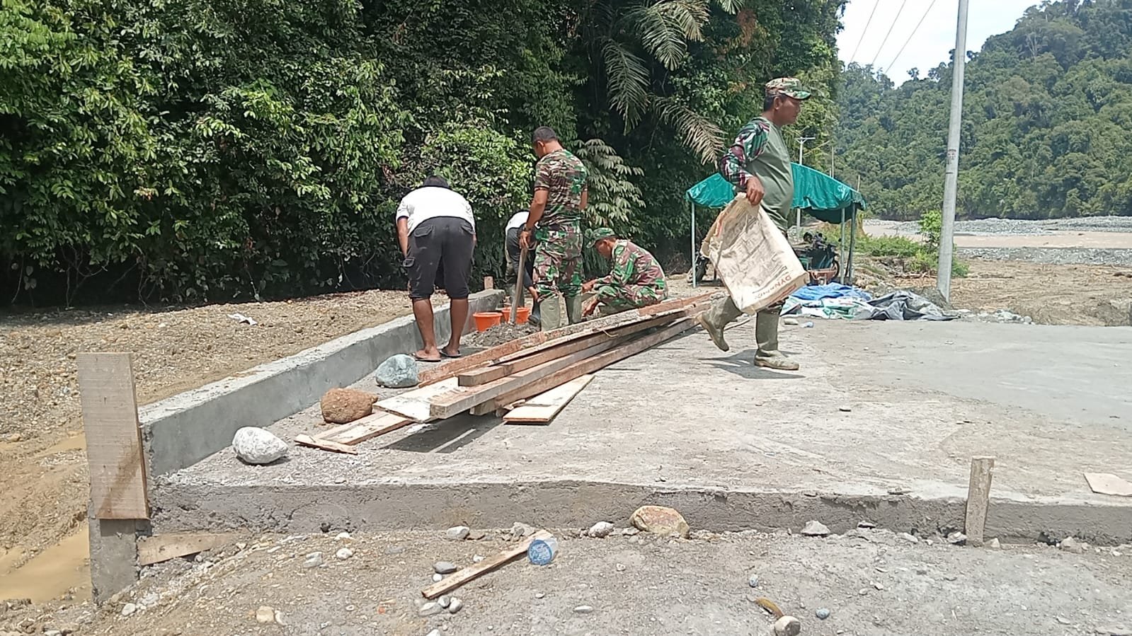 Sejak pagi hari, personel TNI bersama warga bahu-membahu mengaduk material berupa sirtu dan semen dengan komposisi yang telah ditentukan guna menghasilkan cor beton yang berkualitas. Proses pengerjaan dilakukan secara manual dengan penuh ketelitian agar setiap bagian lantai jembatan memiliki kekuatan yang maksimal.
