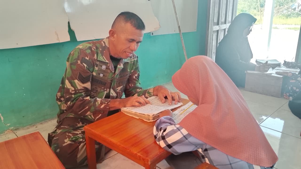 Terlihat Serka Suherman, Sabtu (18/10) sore waktu setempat, salah satu anggota Satgas TMMD, dengan sabar membimbing beberapa anak di mushola desa setiap sore hari. Di balik seragam lorengnya, tersimpan sosok yang penuh kehangatan dan kasih sayang terhadap generasi muda.