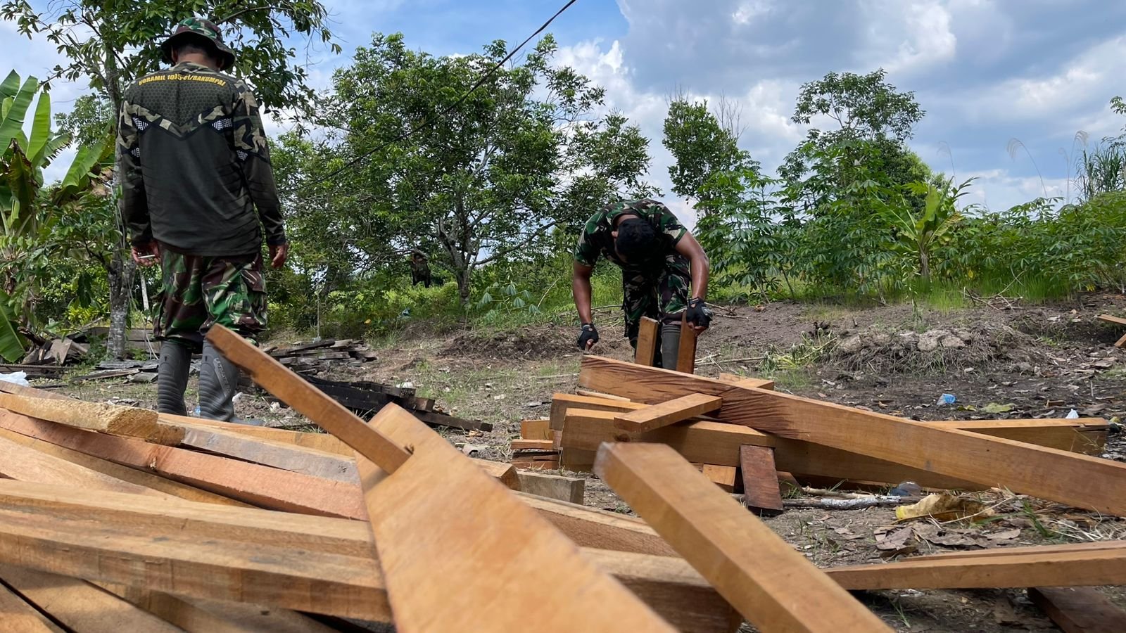 Dengan alat sederhana, mereka meruncingkan kayu ulin untuk dijadikan tonggak pancang tiang bangunan rumah. Aktivitas itu mungkin terlihat kecil, namun menjadi bagian penting dalam proses mewujudkan tempat tinggal layak bagi warga yang membutuhkan.