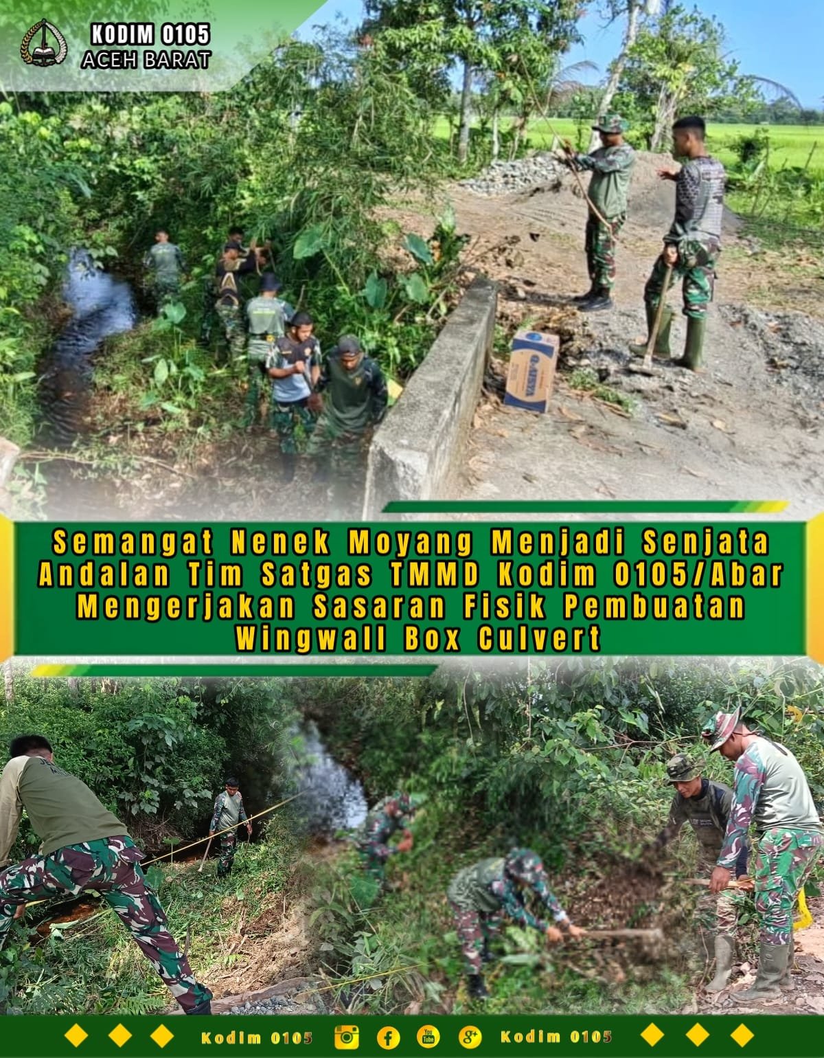 ACEH BARAT – Perjuangan dan kerja keras ditunjukkan Tim Satgas TMMD Reguler ke-127 Kodim 0105/Abar bersama masyarakat yang secara manual bahu-membahu mengerjakan sasaran fisik pembuatan wingwall box culvert di lokasi TMMD Desa Pasie Aceh, Kecamatan Woyla, Rabu (11/2/2026).