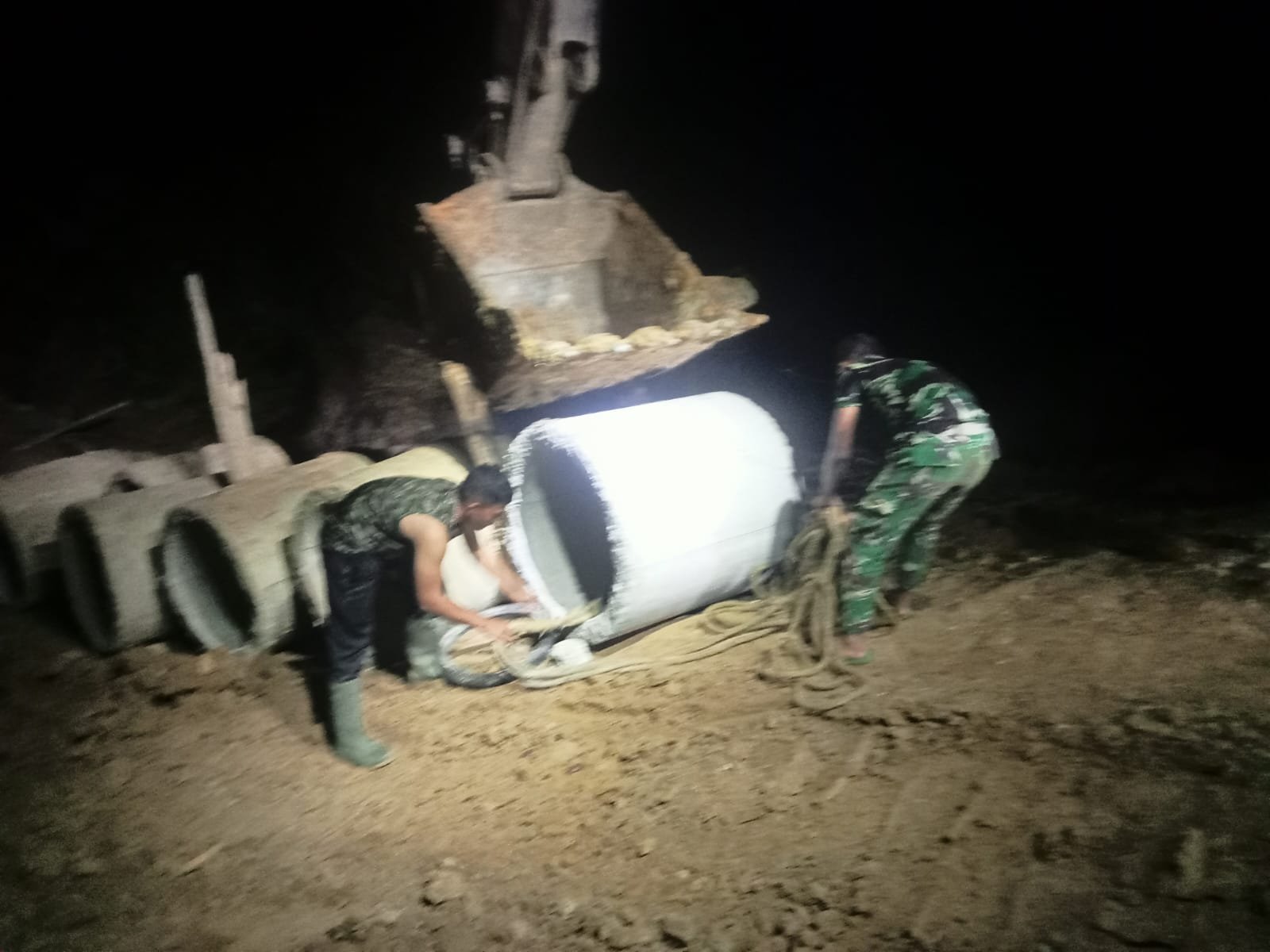 Pada Sabtu (7/3/2026) malam, para anggota satgas terlihat melanjutkan pekerjaan distribusi gorong-gorong yang akan dipasang sebagai bagian dari sistem drainase jalan yang sedang dibangun melalui program TMMD.