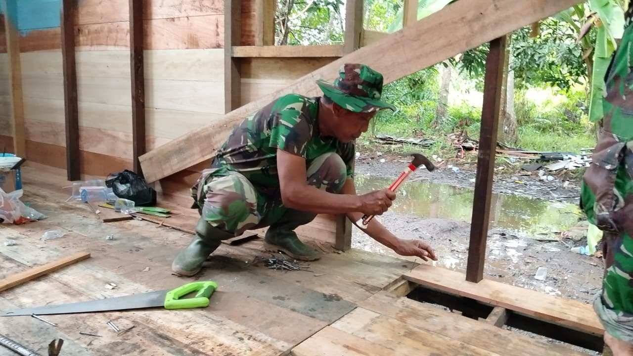 Dari dua unit rumah yang direhab melalui TMMD, satu unit telah selesai 100 persen, sementara satu unit lainnya telah mencapai 45 persen dan terus dikebut oleh anggota Satgas.
