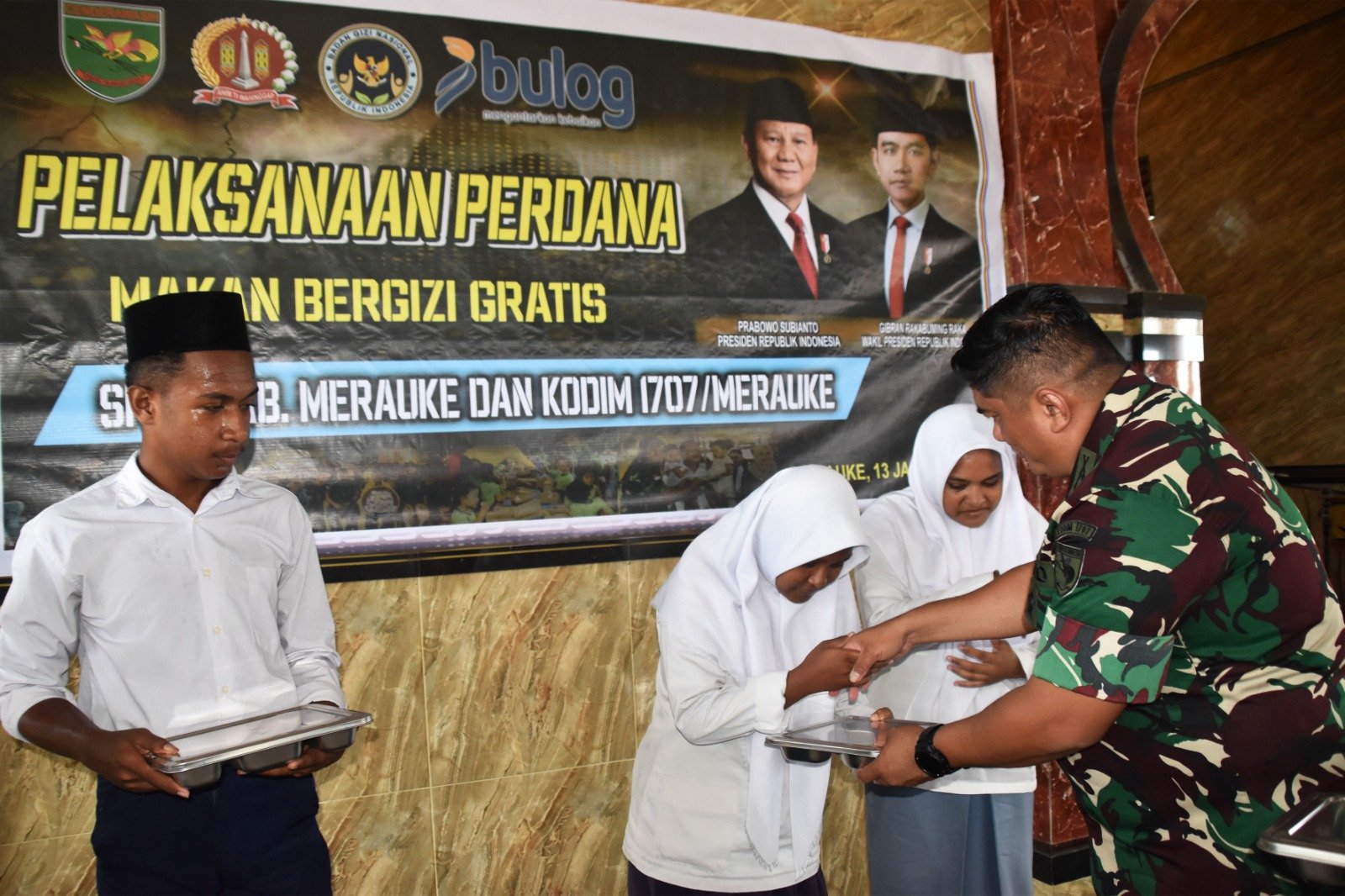 <p>Komandan Kodim 1707 Merauke Letkol Inf Johny Nofriadi, S.E., M.Han mengatakan, SPPG Kabupaten Merauke Kodim 1707/Merauke melaksanakan perdana pemberian Makan Bergizi Gratis (MBG) di tujuh (7) sekolah yang berada di Merauke dengan jumlah 3.168 paket diberikan kepada siswa-siswi. Senin (13/1/2025).</p>