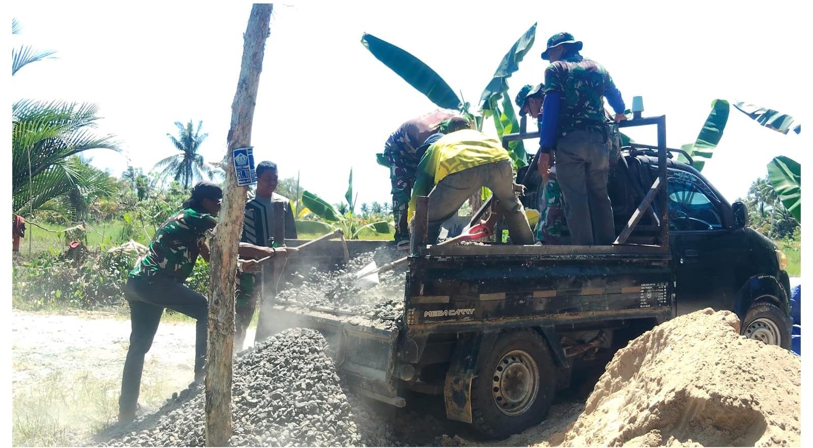 Kegiatan ini berlangsung dengan penuh semangat dan koordinasi yang baik, melibatkan personel TNI dari Kodim 1005/Barito Kuala serta masyarakat setempat yang turut serta membantu. Terlihat para personel dan warga bahu-membahu memindahkan material berupa batu pecah dan pasir menggunakan alat bantu sederhana maupun kendaraan pengangkut, menunjukkan semangat gotong royong yang masih sangat kental.