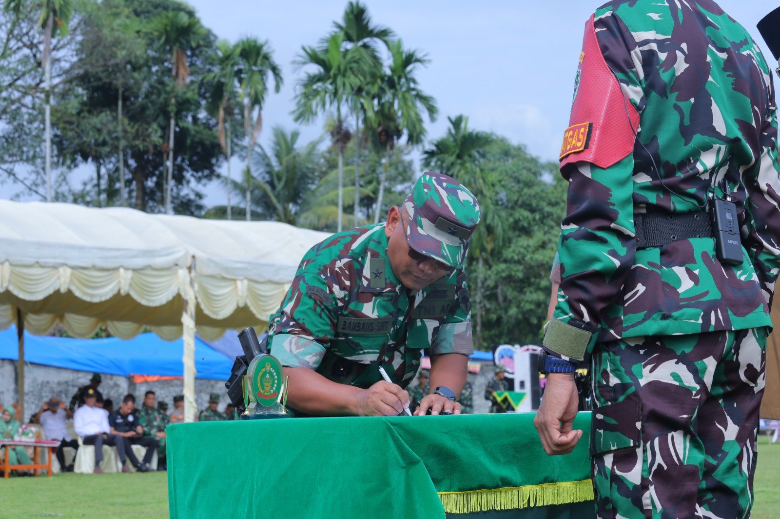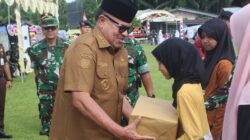 Lapangan desa yang menjadi lokasi upacara pagi itu tampak dipadati peserta. Suasana penuh kebersamaan terlihat dari kehadiran unsur Forkopimda, termasuk Bupati TR. Keumangan, pejabat TNI, Polri, serta tokoh masyarakat.