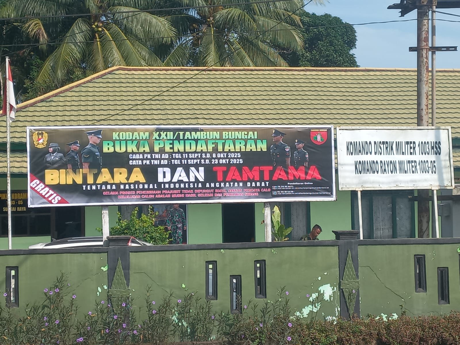 HULU SUNGAI SELATAN – Berikan informasi dan sosialisasi kepada masyarakat Kabupaten Hulu Sungai Selatan (HSS) kususnya para kaum pemuda dan pemudi tentang pembukaan Rekrutmen TNI AD tahun 2025, jajaran Kodim 1003/HSS pasang spanduk yang berisikan informasi persyaratan maupun batas waktu pendaftaran calon TNI AD tahun 2025. Senin (29/9/25)