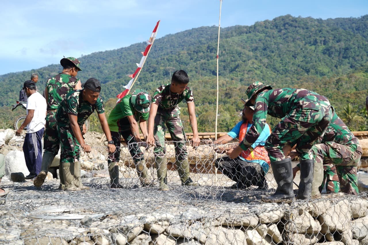 Dalam rangka pemulihan pascabanjir yang melanda Kecamatan Beutong Ateuh Benggalang, Kabupaten Nagan Raya, prajurit Korem 012/TU dan Yon TP 856 bersama warga secara gotong royong terus menyiapkan bronjong sebagai dasar jembatan. Sementara itu, Dinas Pekerjaan Umum (PU) menggunakan alat berat excavator untuk memperbaiki aliran sungai lama serta menyiapkan jalan sementara yang sebelumnya terputus.