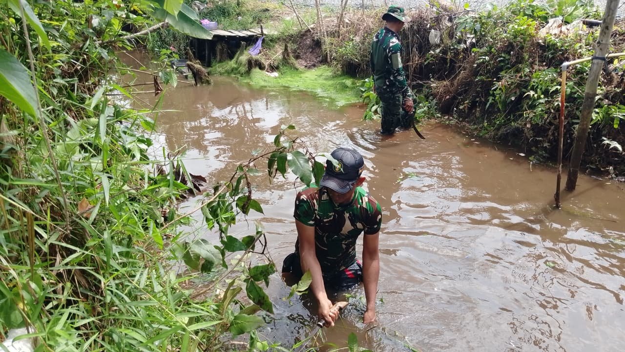 Dengan semangat kebersamaan, Serma Ardiansyah bersama warga bahu membahu membersihkan sampah dan tumbuhan liar yang menghambat aliran sungai.