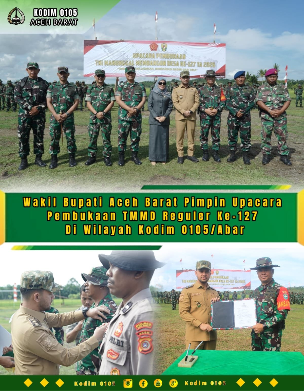 ACEH BARAT – Program TNI Manunggal Membangun Desa (TMMD) Reguler ke-127 wilayah Kodim 0105/Aceh Barat secara resmi dibuka oleh Wakil Bupati Aceh Barat, Said Fadheil, S.H. Upacara yang mengusung tema “TMMD Satukan Langkah, Membangun Negeri Dari Desa” ini digelar di Lapangan Bola Kaki Desa Lueng Jawa, Kecamatan Woyla, Selasa (10/02/2026).