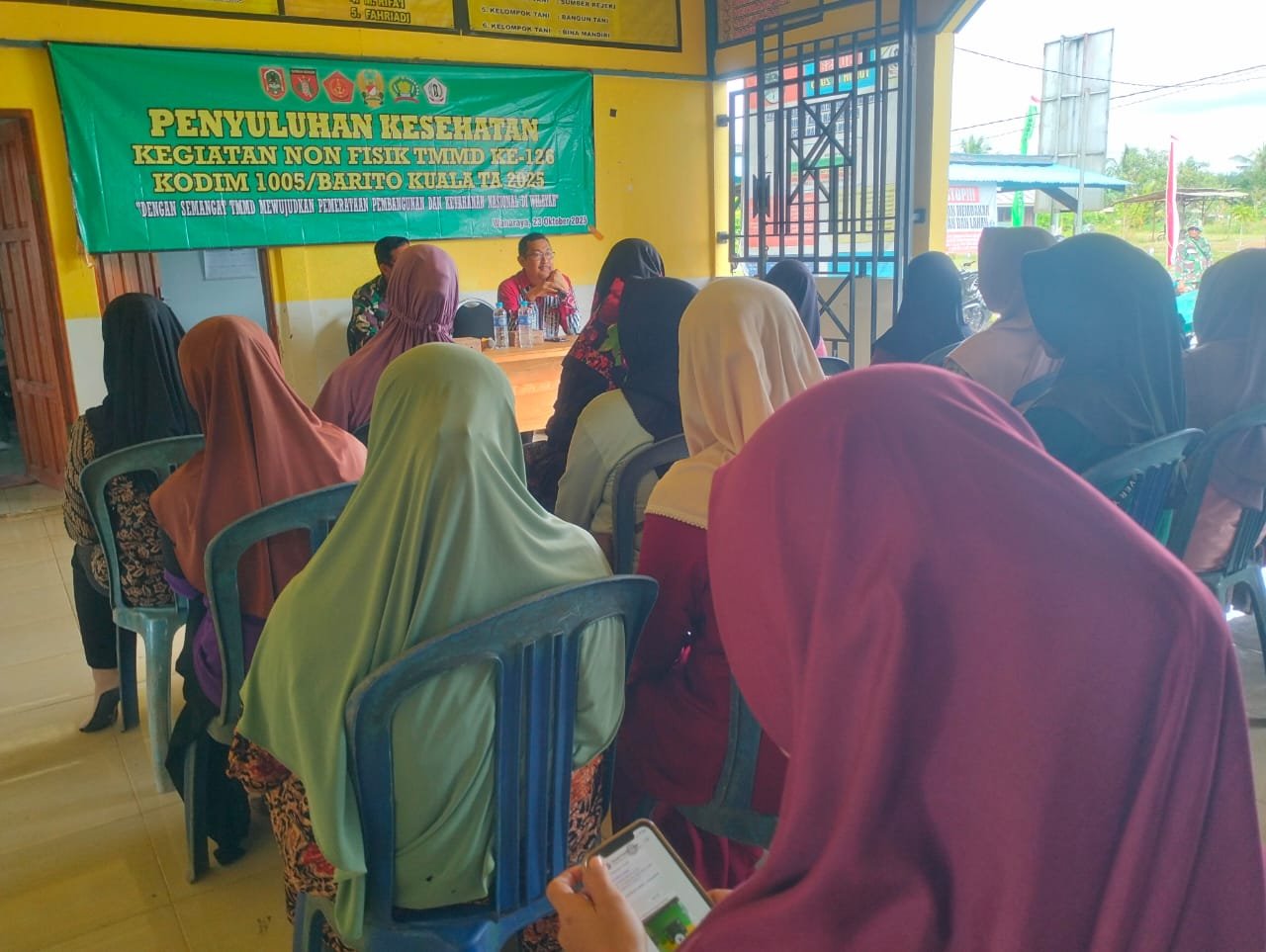 BARITO KUALA – Program TNI Manunggal Membangun Desa (TMMD) ke-126 Kodim 1005/Barito Kuala tidak hanya fokus pada pembangunan fisik, tetapi juga memberikan perhatian terhadap peningkatan kualitas sumber daya manusia melalui kegiatan nonfisik. Salah satunya adalah penyuluhan kesehatan yang digelar di Desa Tumih, Kecamatan Wanaraya, Kabupaten Barito Kuala, kAMIS (23/10).