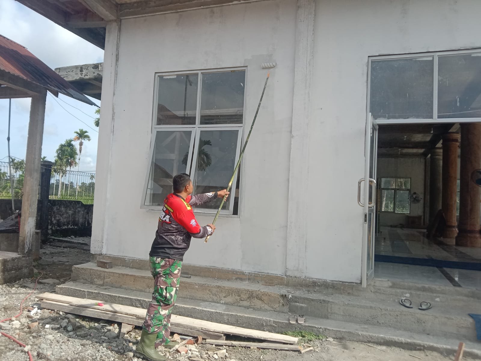 Suasana di sekitar masjid pun terasa berbeda. Aroma cat yang masih segar seakan menjadi pertanda bahwa ada harapan yang sedang diperbarui. Warna yang perlahan menempel di dinding bukan sekadar lapisan cat, melainkan simbol kepedulian dan semangat kebersamaan antara TNI dan masyarakat.