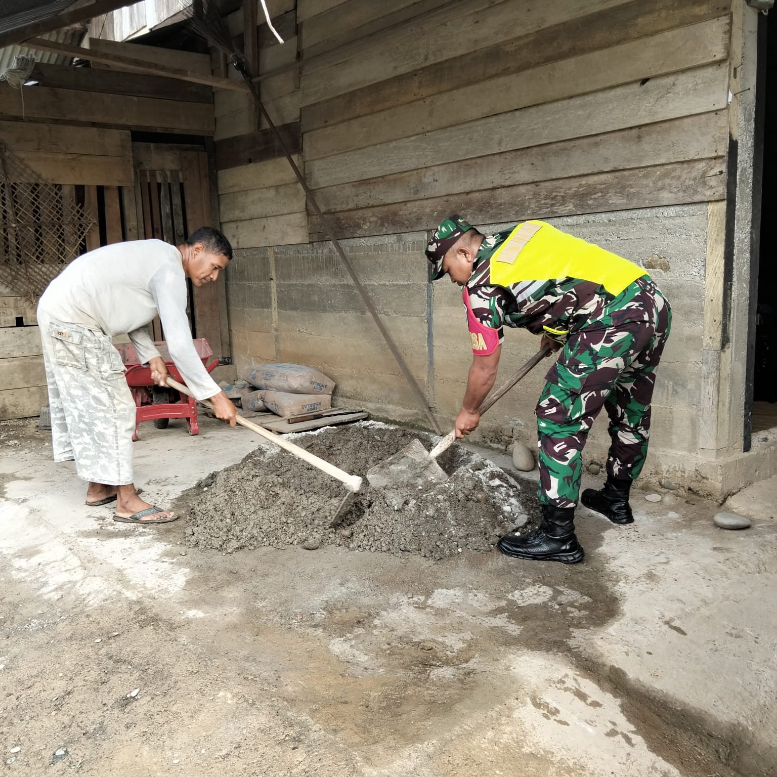 ACEH BARAT β Wujud nyata dan peran aktif Babinsa Koramil 01/Sungaimas Kodim 0105/Abar, Koptu Andri, dalam mengatasi kesulitan rakyat di wilayah binaan ditunjukkan dengan keterlibatannya secara langsung membantu mengaduk semen untuk pengecoran lantai rumah milik salah satu warga di Desa Geudong, Kecamatan Sungaimas, Kabupaten Aceh Barat, Sabtu (01/11/2025).