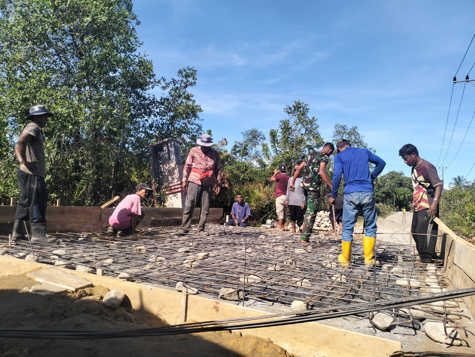 ACEH SELATAN – Sinergi antara TNI dan masyarakat terus terlihat dalam pembangunan Jembatan Aramco di Desa Pasi Rasian, Kecamatan Pasi Raja. Hari ini Sabtu (11/4/2026), progres pembangunan memasuki tahap pemasangan rangka besi pada badan jembatan sebagai persiapan pengecoran.